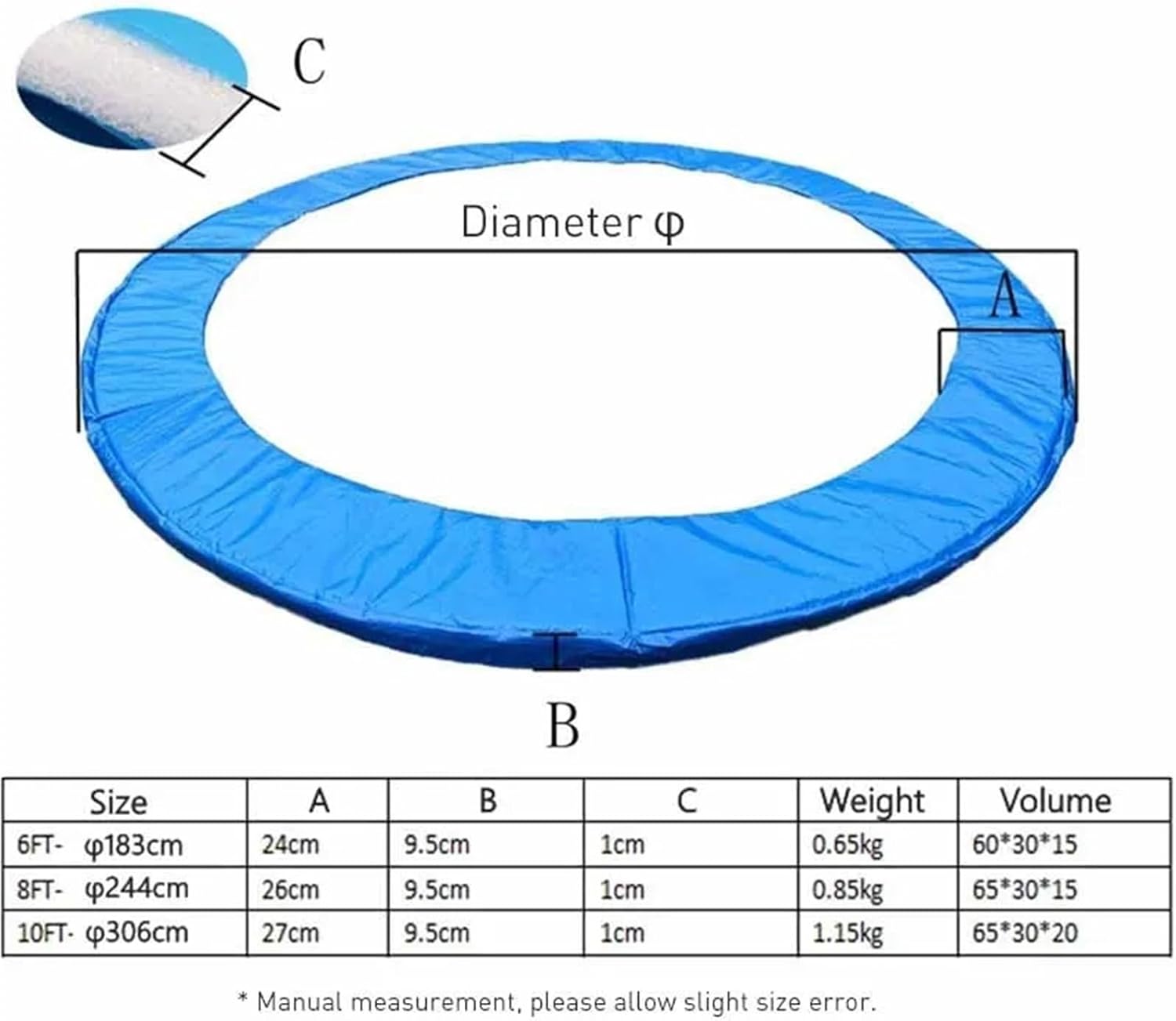 FEATURE* The surface of the edge protection sleeve is made of strong, waterproof PVC. Fill with foam in the middle. The bottom surface is made of PE. In addition, the lid is corrosion-resistant and wear-resistant.* This waterproof and replaceable PVC shell is not easy to deform and easy to clean. It can effectively protect the trampoline and delay the aging of the trampoline.* The hiddens strap makes it easy to fix the frame to the frame of the frame. Easy to cover, you can connect the circle firmly to the trampoline.* The spring cover is easy to install and remove. The surface is made of weather-resistant and waterproof PVC, which is easy to clean.* The thickened trampoline safety mat can provide you with a safer jumping experience! Specification: 6feet,8 feet,10 feetPACKING LIST1 x Trampoline protection matNOTE1. Actual color may be slightly different from the image due to different monitor and light effect.2. Please allow 1-3cm deviation due to manual measurement.