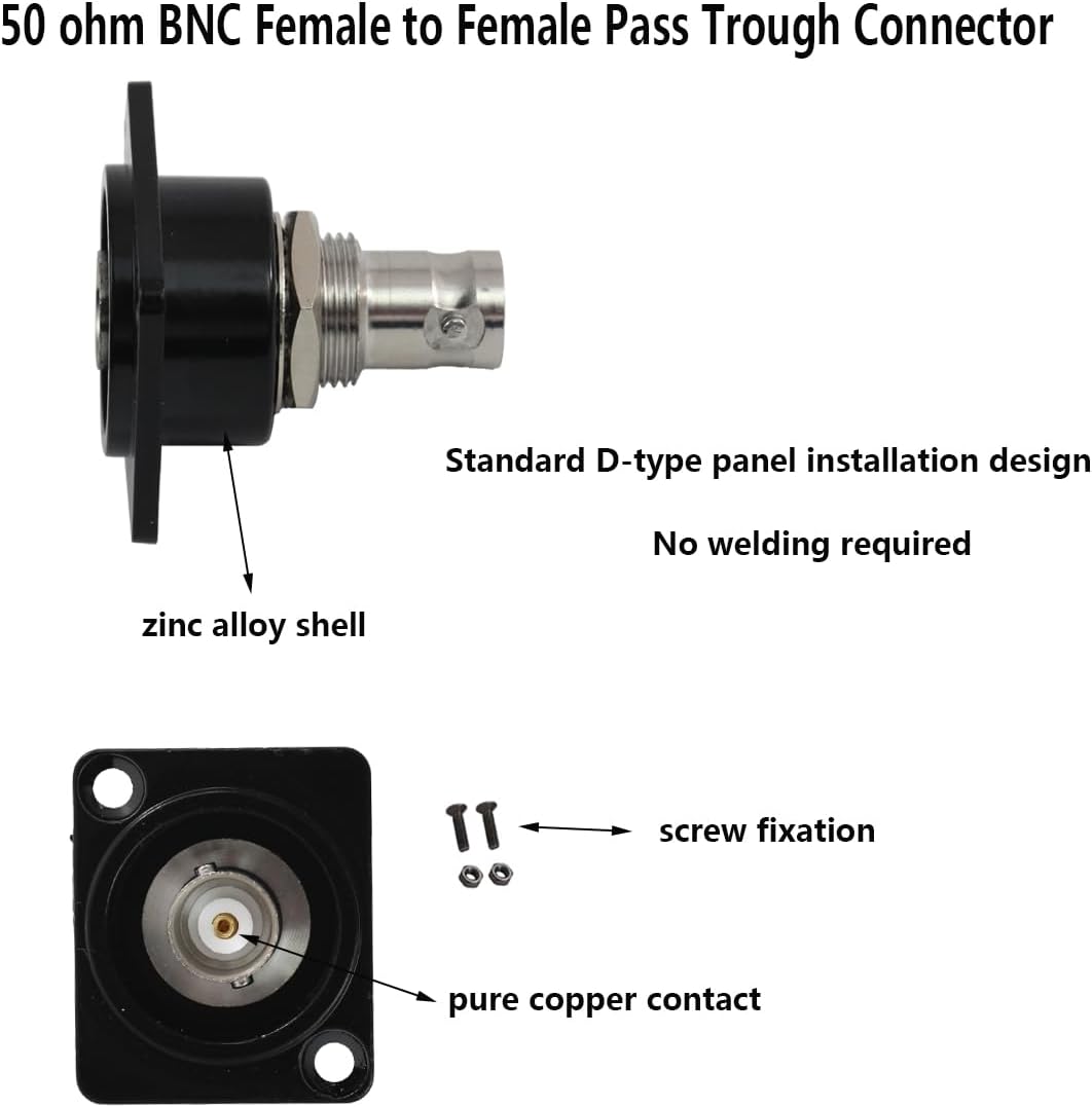 The BNC Female-to-Female Feed-through Connector is a high-quality adapter designed to seamlessly connect two BNC coaxial cables, enabling stable signal transmission in demanding environments. Constructed with durable materials and precision engineering, this connector ensures reliable performance for custom communication systems, surveillance setups, and digital networks. Its compact design and ease of installation make it a versatile solution for both professional and residential use. Technical Specifications Type: BNC Female-to-Female Feed-through Connector (Panel Mount) Impedance: 50 ohm Housing Material: Zinc alloy Center Pin Material: Copper Installation Type: D-style chassis panel mount (plug-and-play) Compatibility: Works with standard BNC coaxial cables Package contains: 10PCS BNC connector 20 sets screws